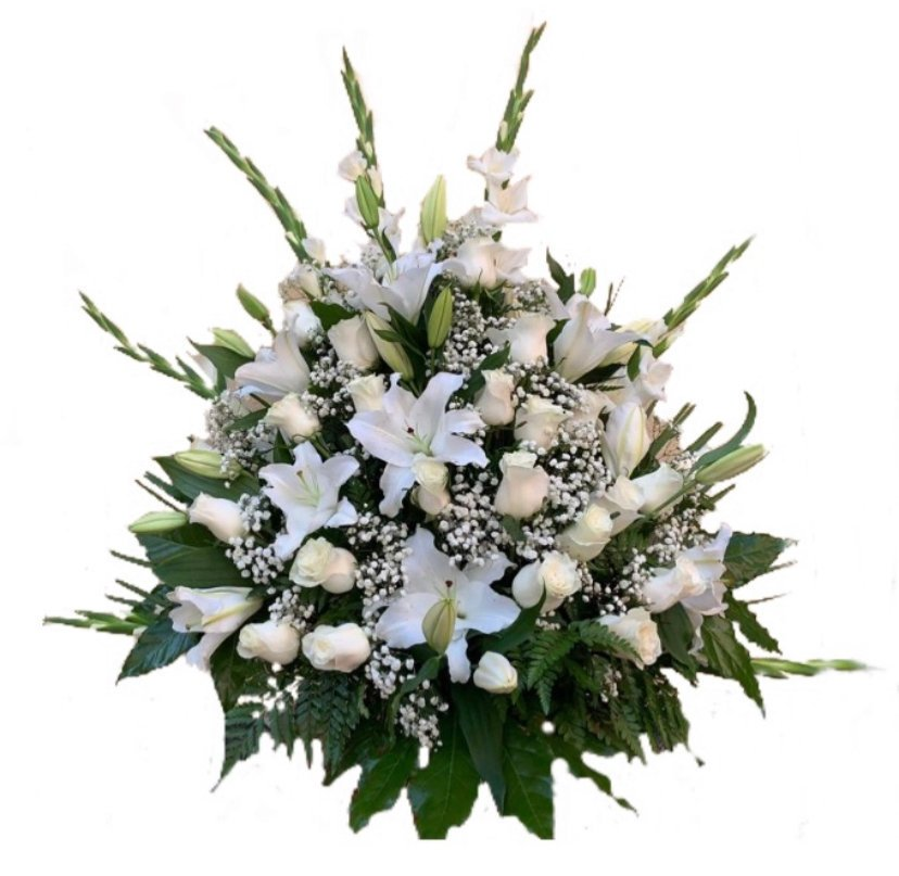 Esta compuesto por gladiolos blancos, lirios, claveles y verdes silvestres que están dispuestos a crear una hermosa muestra de cariño.
