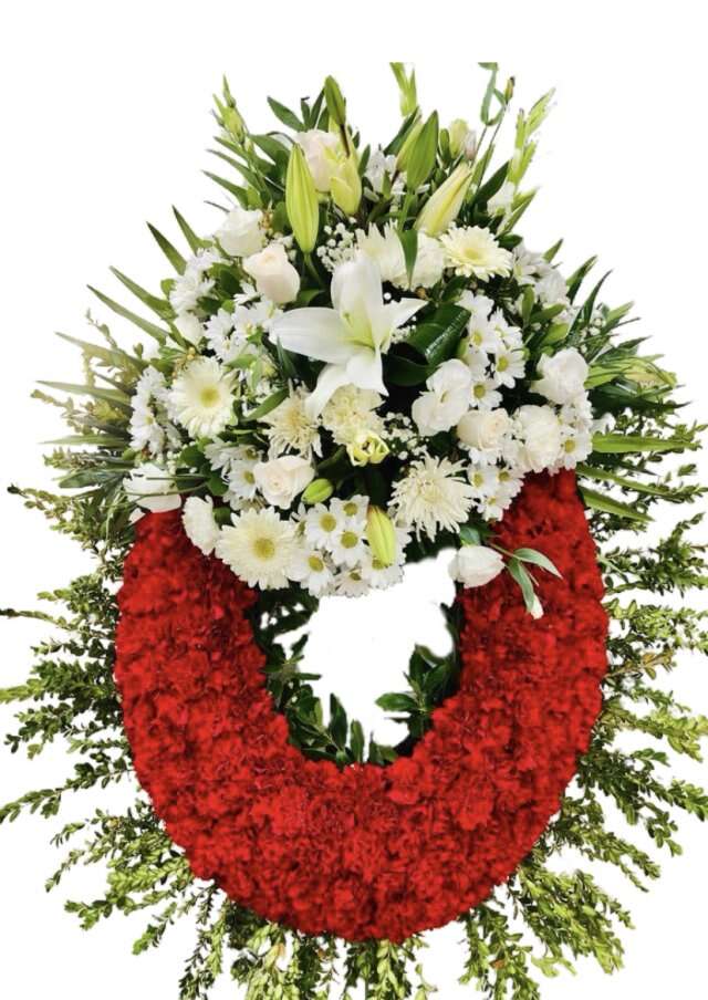 Esta corona funeraria superventas para el Tanatorio de Valdemoro expresa un gran sentimiento de condolencia con cada delicada flor. compuesta con brillantes rosas blancas, lirios asiáticos, pequeños claveles blancos y anastasias que están bellamente dispuestos a mostrar una elegante corona acentuada con exuberantes y vibrantes verdes. Exhibido en caballete, este hermoso tributo es un maravilloso símbolo de vida eterna y dulce serenidad.